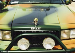 "Skully” hood ornament with eyes that light up wearing GI Joe Helmet.